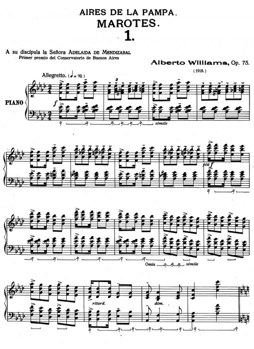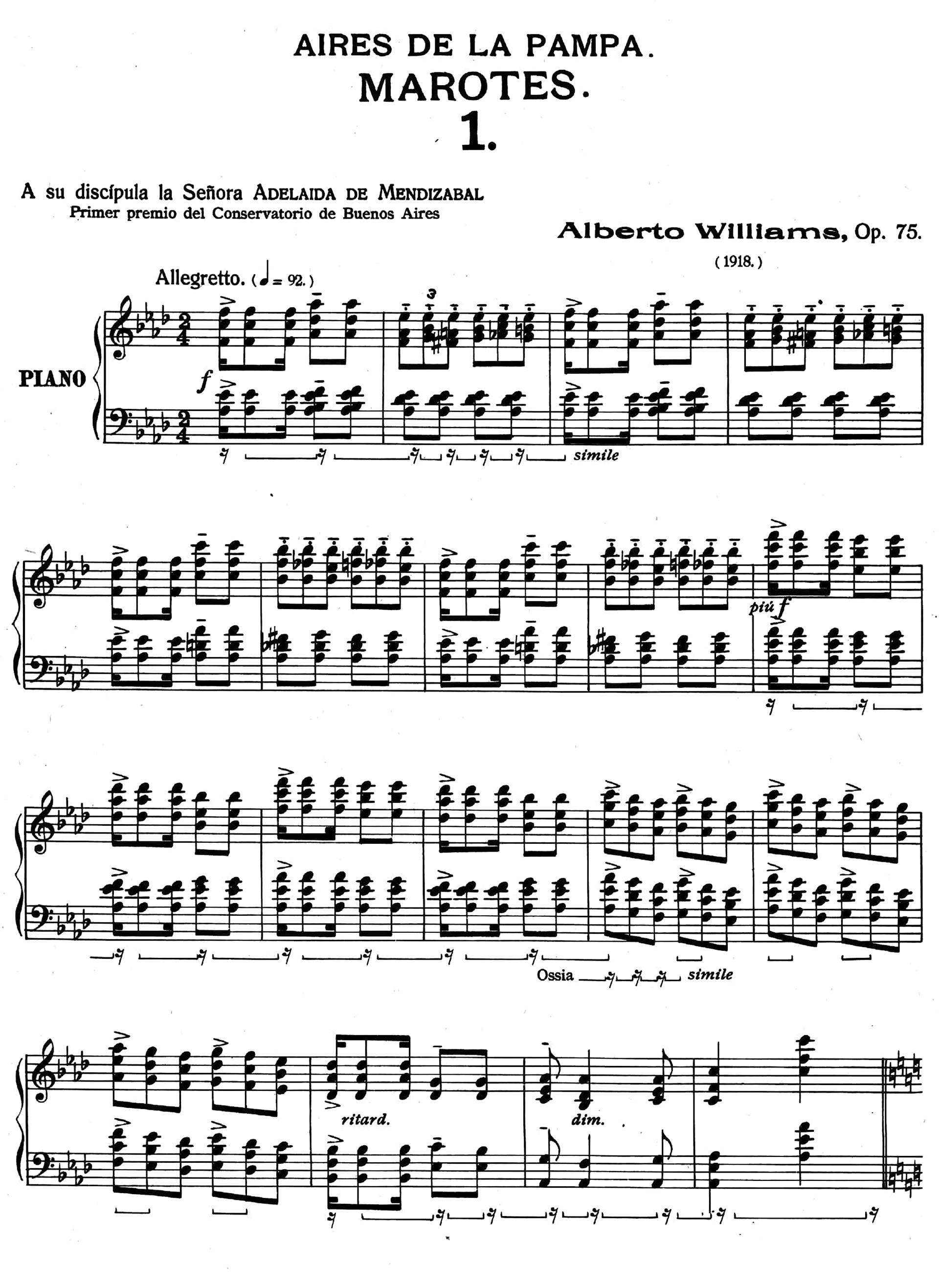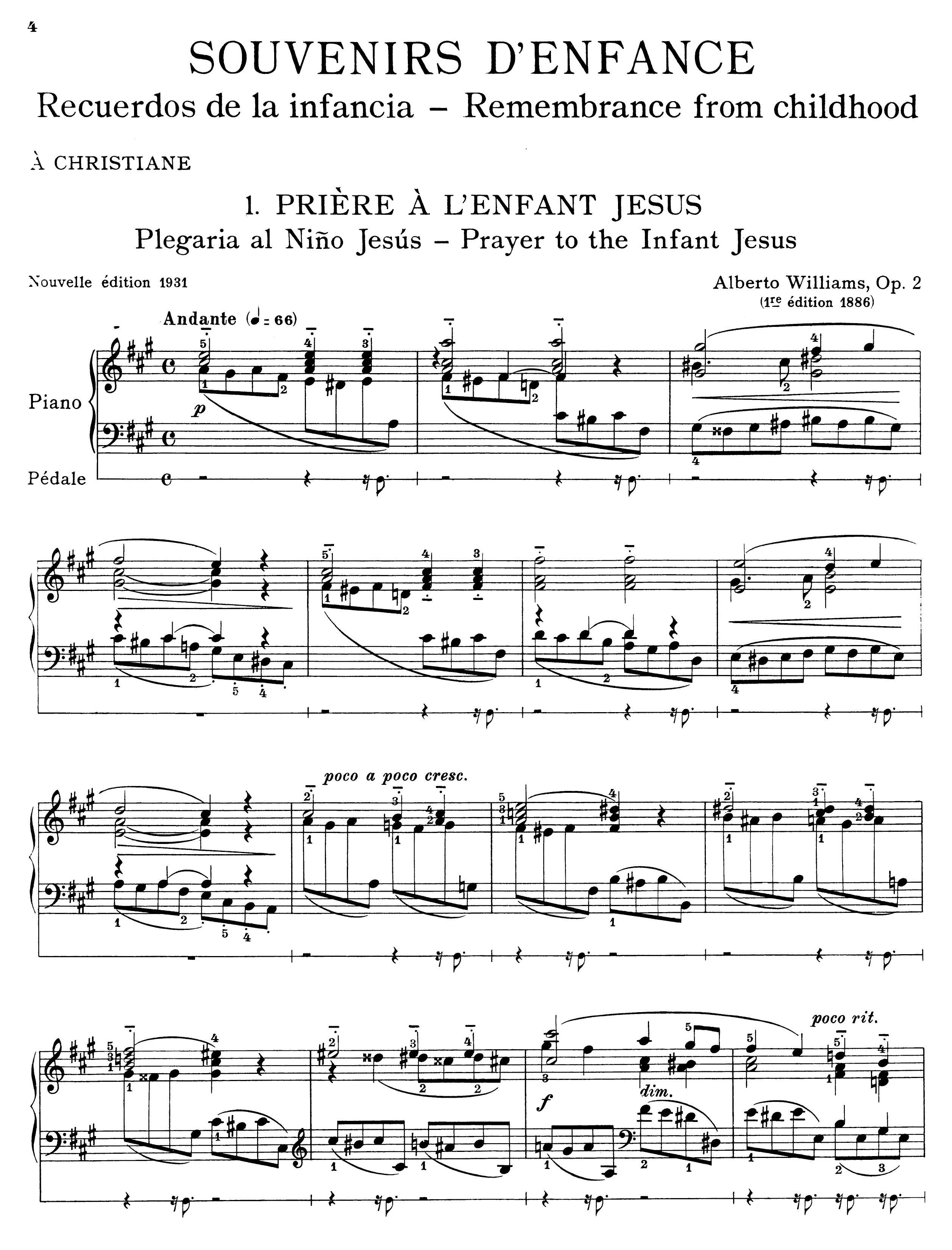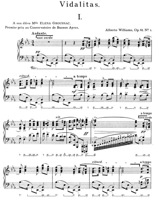 Alberto Williams (1862-1952) was an Argentine composer, pianist, pedagogue, and conductor. In 1882 he went to study music composition at the Paris Conservatoire, where he was mentored by pianists Georges Mathias and Charles de Bériot, and learned harmony with Emile Durand and counterpoint with Ernest Guiraud. He furthermore took private lessons in composition from César Franck