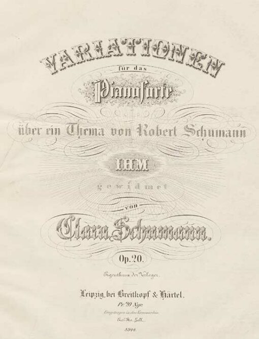 Clara Schumann (Clara Josephine Wieck; 13 September 1819 – 20 May 1896) was a German musician and composer, considered one of the most distinguished pianists of the Romantic era. She exerted her influence over a 61-year concert career, changing the format and repertoire of the piano recital and the tastes of the listening public. Her husband was the composer Robert Schumann. She and her husband encouraged Johannes Brahms, and she was the first pianist to give public performances of some of Brahms’ works, notably the Variations and Fugue on a Theme by Handel.
