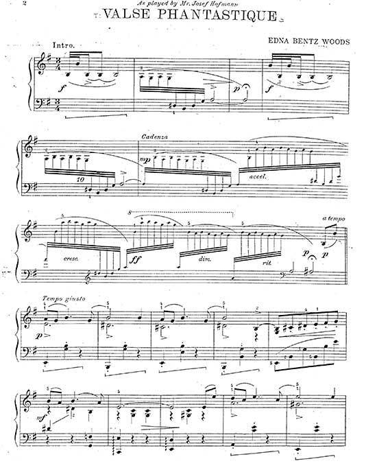 Edna Bentz Wood was an american female pianist lived among the XIX and XX century. The package includes her famous Valse Phantastique as played by Ignaz Hofmann and Marc-Andrè Hamelin