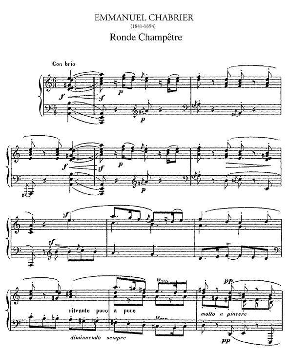 Alexis Emmanuel Chabrier (1841 – 1894) was a French Romantic composer and pianist. Although known primarily for two of his orchestral works, España and Joyeuse marche, he left an important corpus of operas (including L’étoile), songs, and piano music. He was admired by composers as diverse as Debussy, Ravel, Richard Strauss, Satie, Schmitt, Stravinsky, and the group of composers known as Les six.