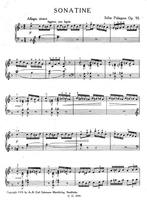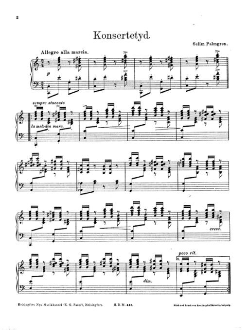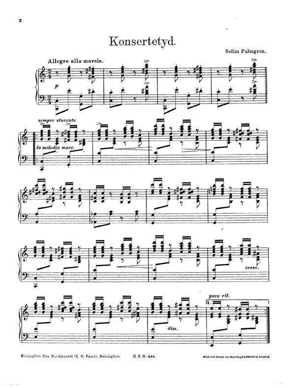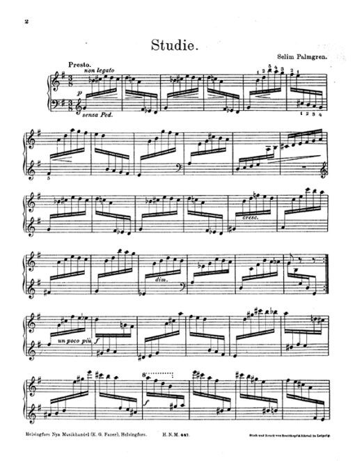 Selim Gustaf Adolf Palmgren, dubbed “The Finnish Chopin”, was a Finnish composer, pianist, and conductor. He wrote music in larger forms such as Piano Concertos, a Sonata in D minor, symphonic works and operas. It was in his shorter piano pieces, and his songs, however – as an inimitable miniaturist – that he achieved his best. He knew how to present a mood or a picture with the minimum of means and the maximum of effect.
